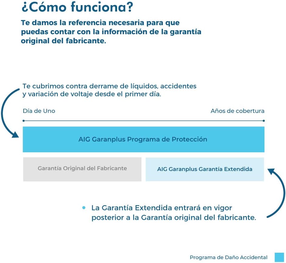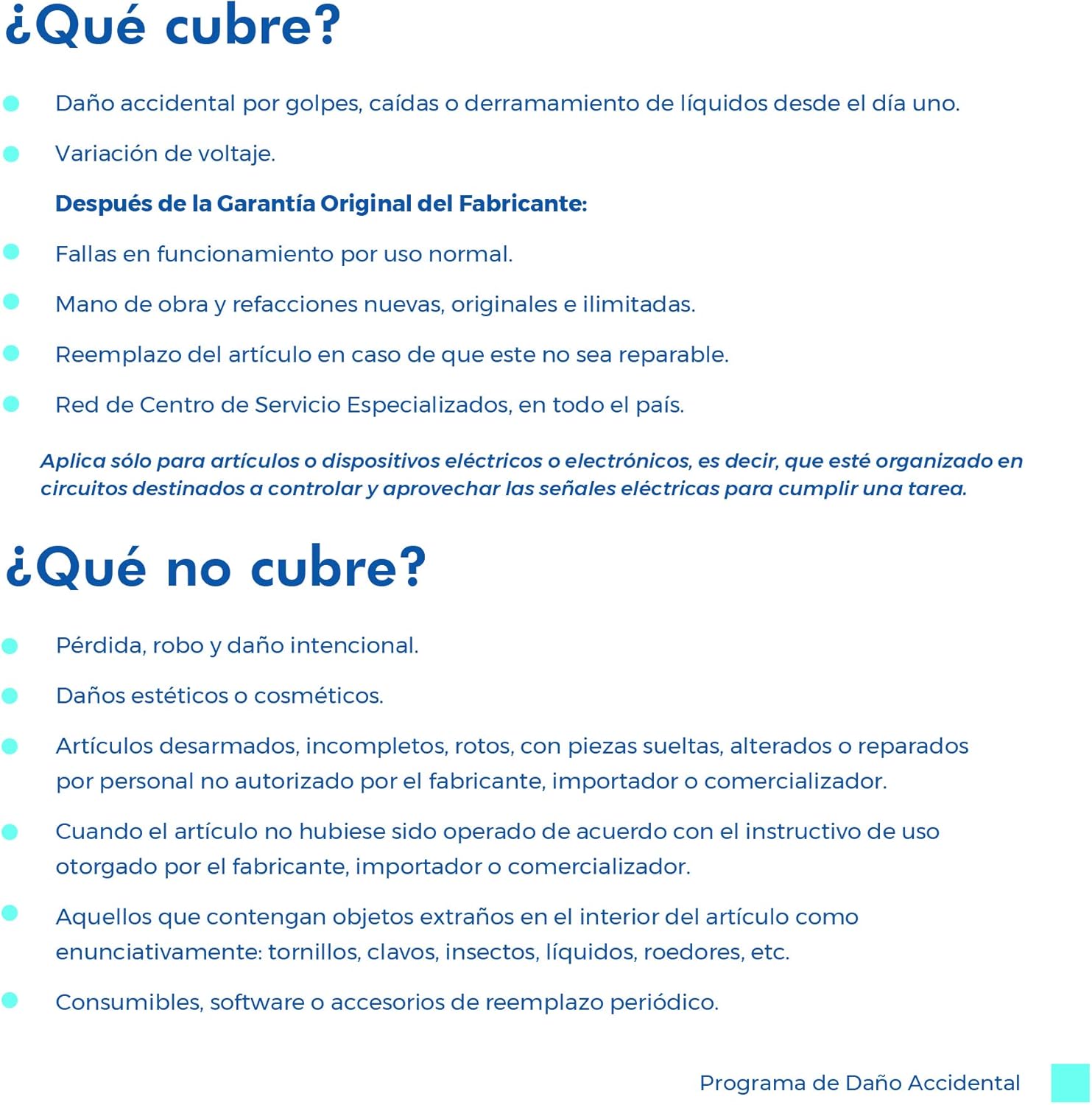- Cobertura de Daño Accidental incluidos golpes, caídas o derramamiento de líquidos desde el día uno, así como cobertura de variación de voltaje.