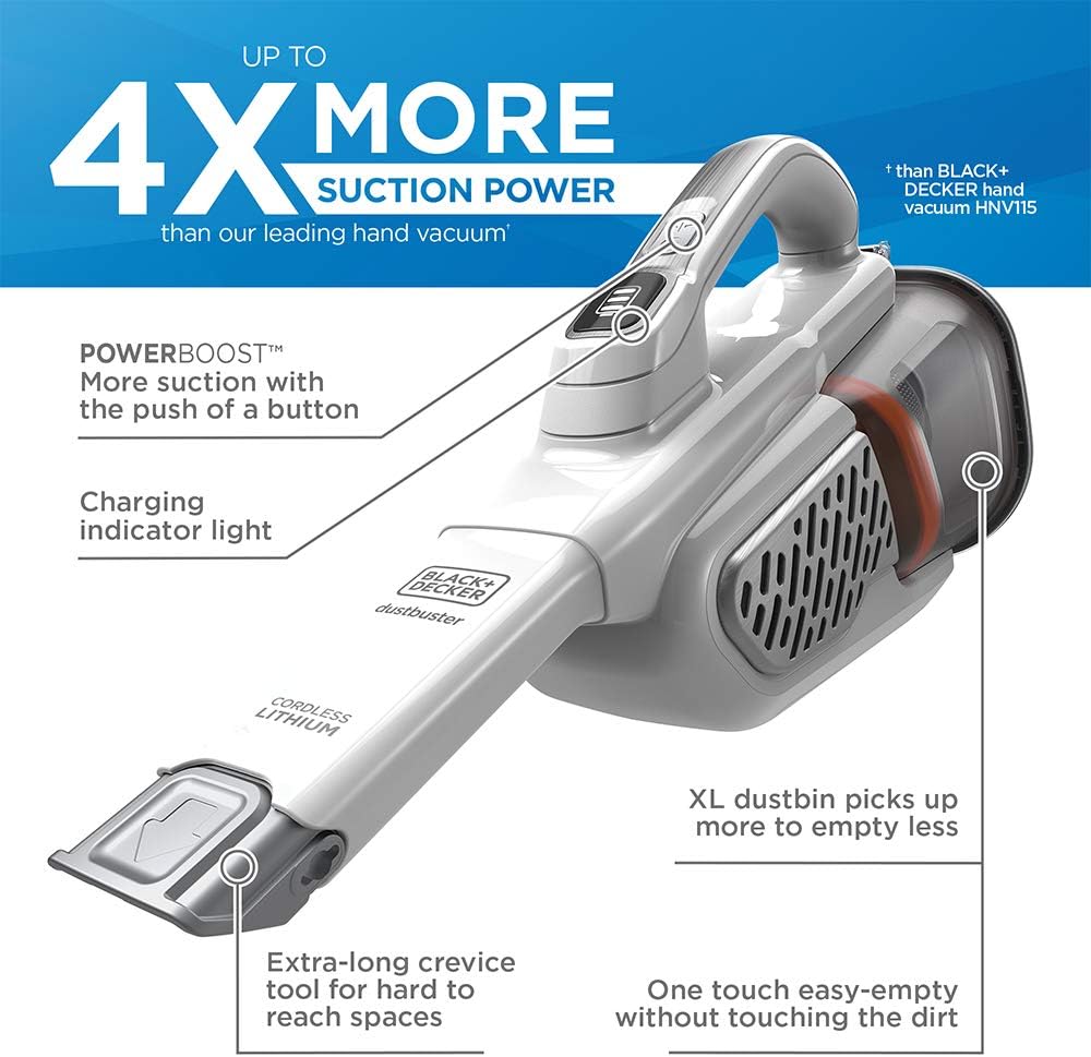 - Hasta 4 veces más potencia de succión que nuestro aspirador de mano líder. El tiempo de carga es de 5 horas.
