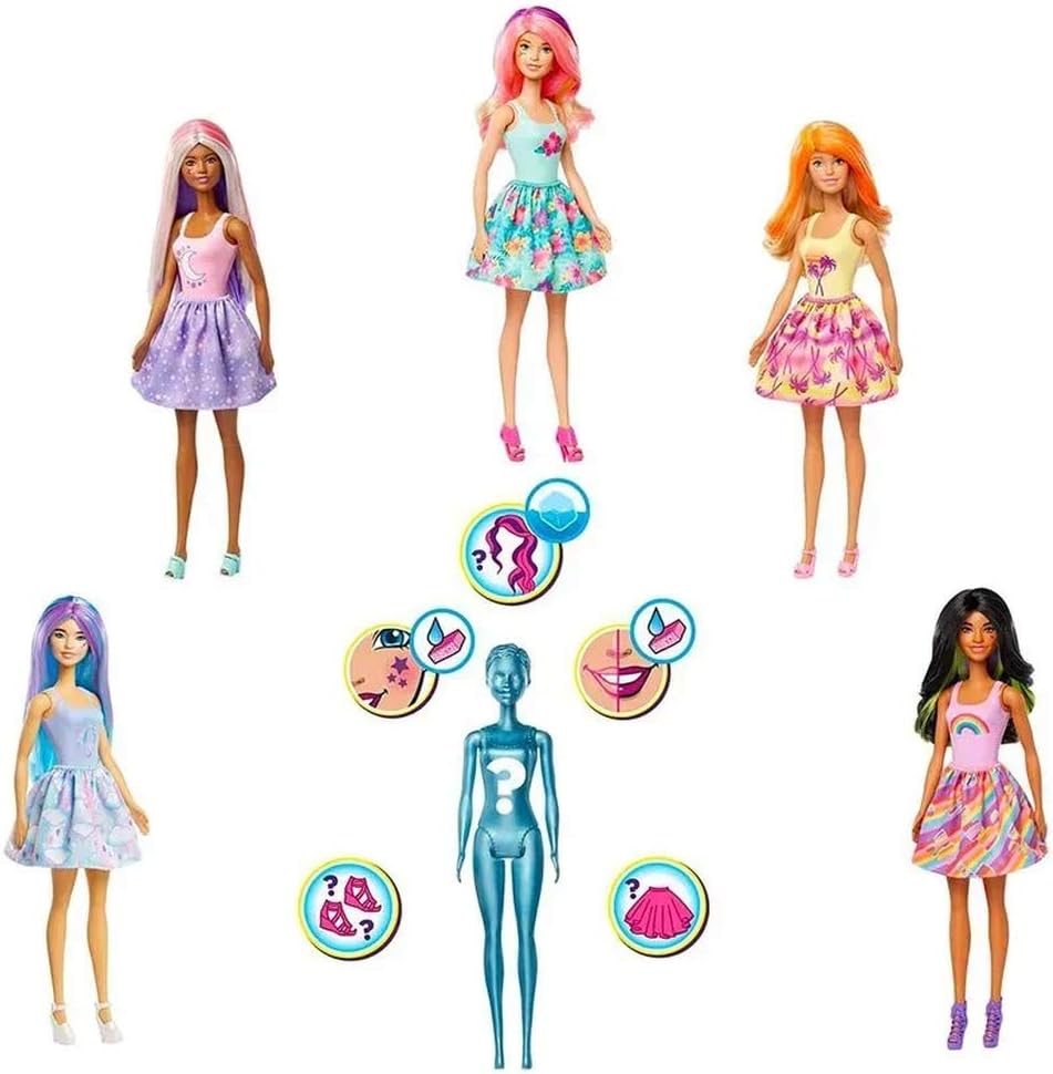 - CON SIETE SORPRESAS en un paquete, las muñecas Barbie Color Reveal brindan todo tipo de deleites: busca las escenas relacionadas con el aire libre como arcoíris, flores, estrellas, nubes de lluvia y palmeras tropicales.