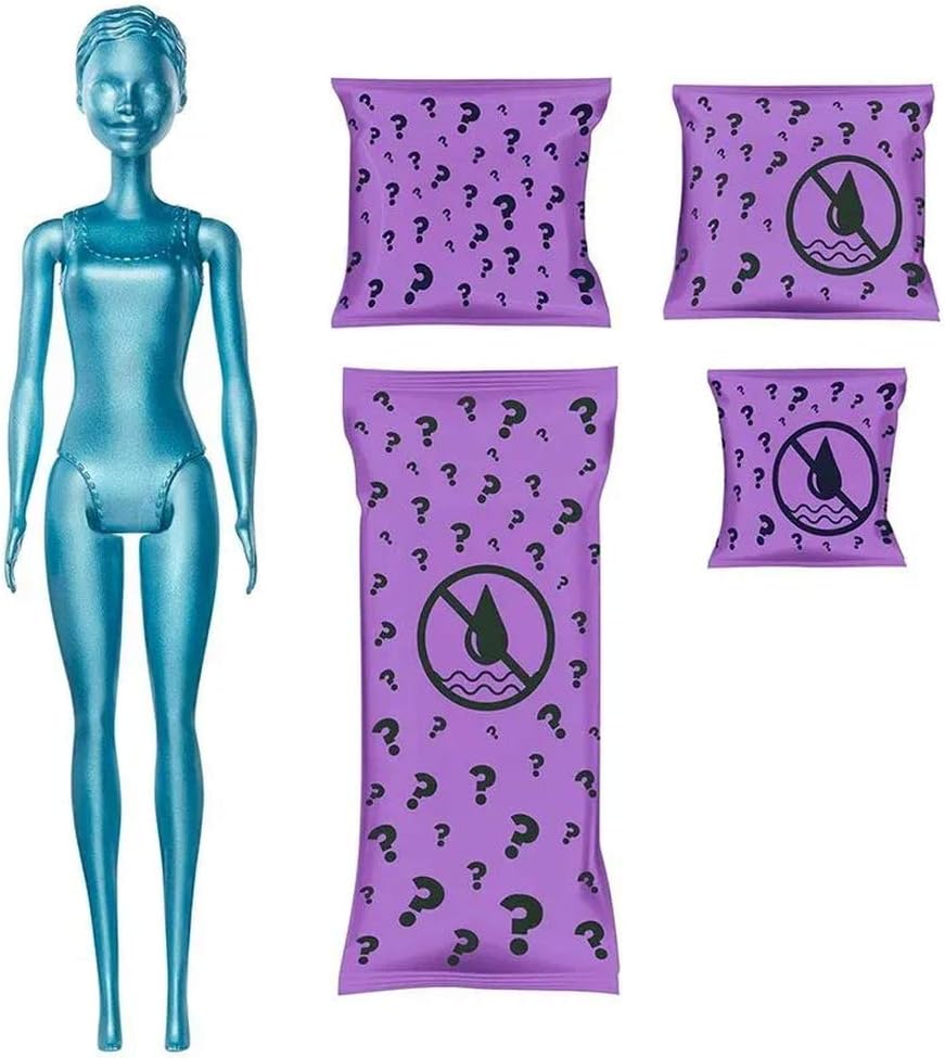 - COMIENZA LA EXPERIENCIA quitando la capa exterior del paquete, gira la parte superior del tubo y saca la muñeca cubierta de pies a cabeza en Color Reveal azul metálico y cuatro bolsas decoradas que mantienen el contenido oculto.