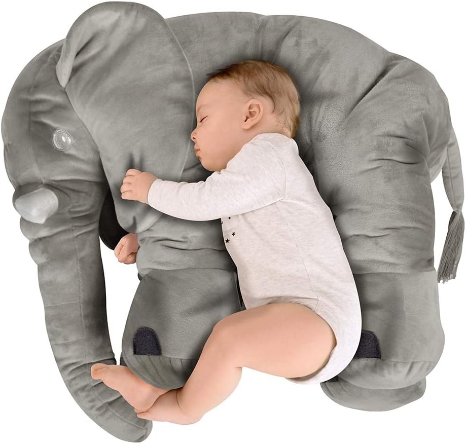 - �MUY SUAVE Y ABRAZABLE PARA LA SEGURIDAD DE TU BEBE- Almohada y cojin antireflujo para bebe muy flexible y suave para que tu bebe pueda acurrucarse, dormir y jugar con él. Está diseñado y pensado en la seguridad y comodidad de tu bebe, por lo que hemos cubierto con tela el cierre para que no raspe a tu bebe, también rellenamos las orejas y la colita del elefante lo que lo hace aún más apapachable. Juguetes para niñas y niños. Gran detalle para mesa de regalos bebe o hasta para niñas de 10 años