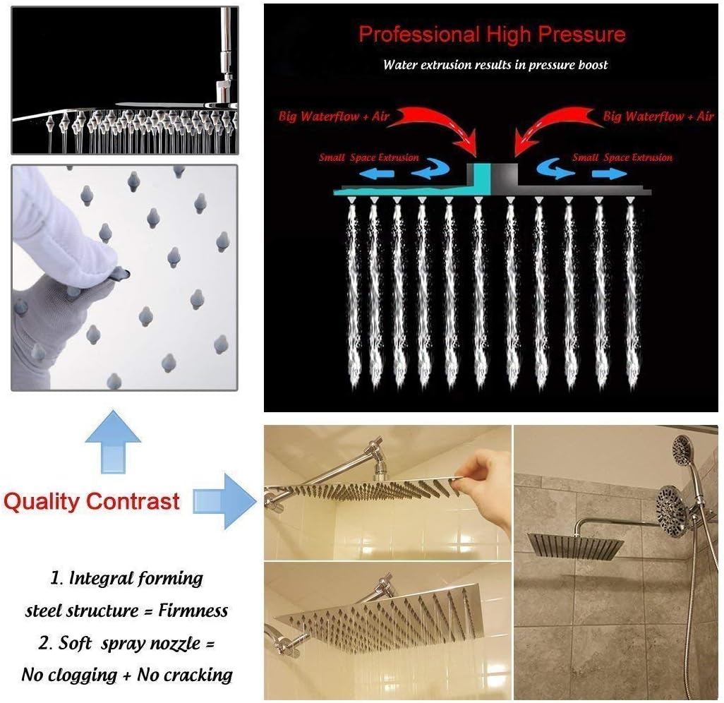 - Flujo de Agua a Alta Presión - El cabezal de ducha es súper grande con 8 por 8 pulgadas. El grosor es de sólo 0.08 pulgadas. La combinación de tecnología ultrafina y de aire acondicionado produce una presión fuerte y alta, optimizada para cualquier presión de agua, como un masaje completo y dinámico para su piel.