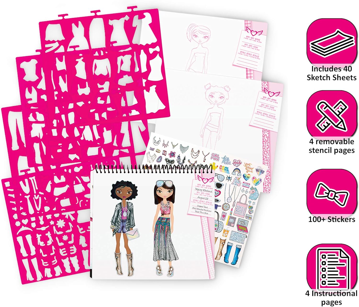 - It comes with removeable, plastic stencil cards with 100+ fashion and accessory shapes to help create your designs on the formated drawing sheets.