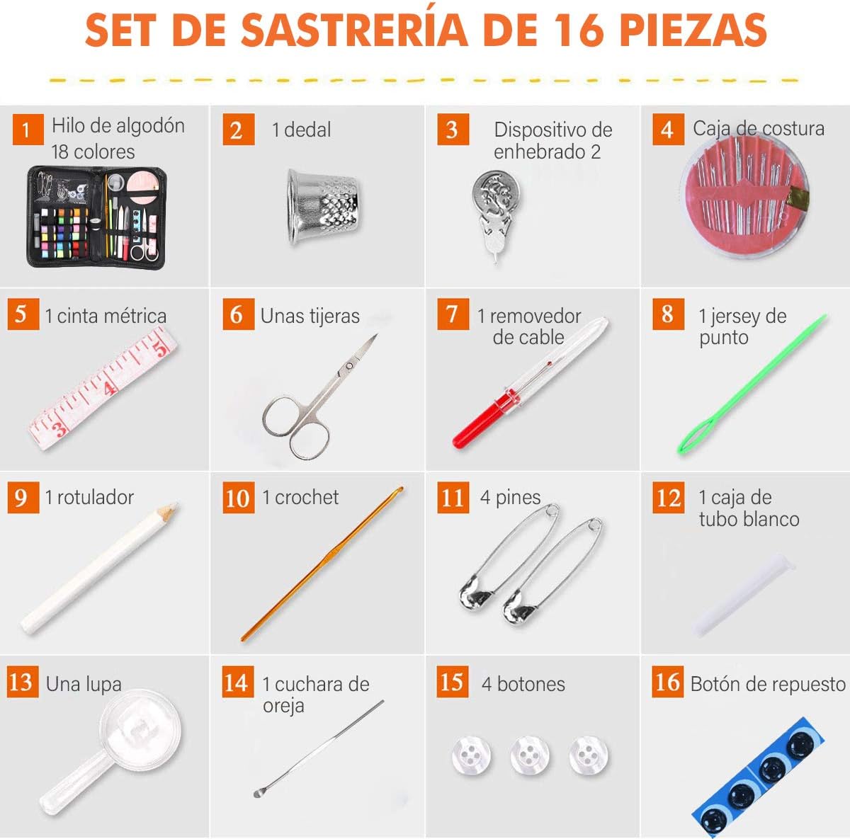 - Kit de costura con 58 piezas: Todo en un kit que incluye hilo de colores, agujas de coser de diferentes tamaños, alfileres, botones y otras herramientas de costura.