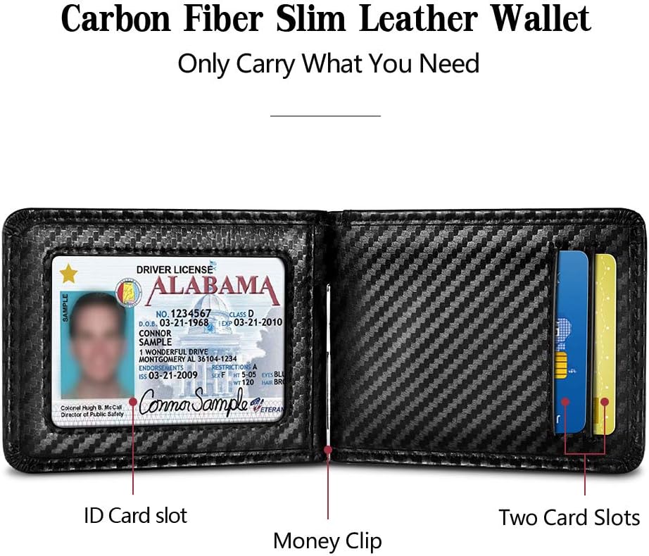 - 6 ranuras para tarjetas (3 en el exterior para tarjetas de uso frecuente, 1 ventana de identificación en el interior para la licencia de conducir y 2 más para tarjetas de crédito u otras tarjetas) 1 clip para guardar dinero en efectivo. La billetera delgada es ideal para llevar tarjetas de visita, tarjetas de crédito y débito, facturas, etc. Si usted es un operador ligero, esta es su billetera imprescindible.