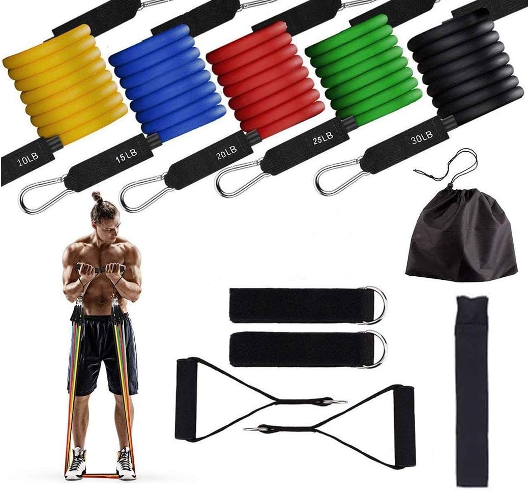 - Juego de 11 Incaluye 5 bandas de resistencia, 2 asas de espuma, 2 correas de tobillo, 1 ancla de puerta, también 1 bolsa de transporte. Perfecto para viajes, gimnasio o uso en el hogar.