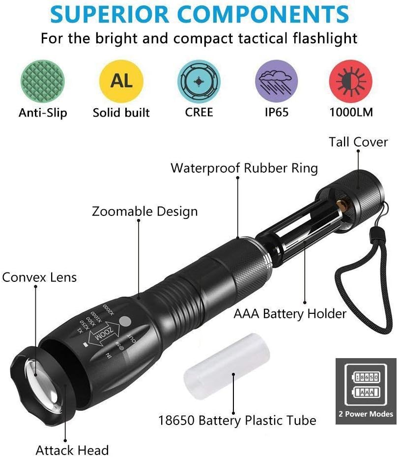 - MULTI-FUNCIÓN Y ANTI-PERDIDA5 patrones de luz: luz de luna / bajo / medio / alto y estrobo con el botón de ENCENDIDO / APAGADO, fácil de operar. Linterna militar con antideslizantes, correa anti-perdida en la linterna para sostenerla en la mano sin temor a perderla.