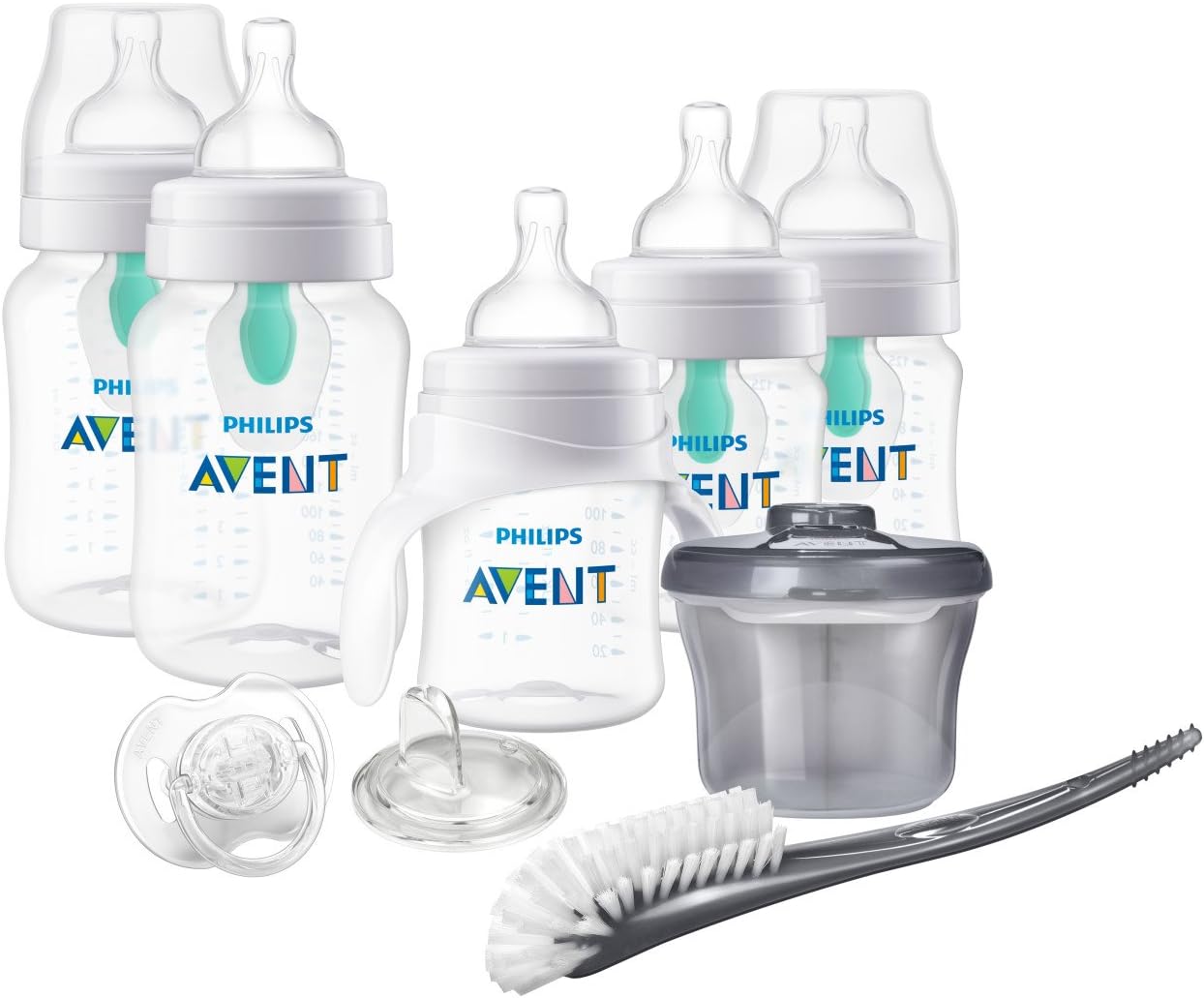 - El set cotiene: 2 biberones Anti-colic de 9oz + 2 biberones Anti-colic de 4oz + 1 cepillo para biberones y tetinas + 1 dosificador de formula + 1 chupon + 1 boquilla + 1 vaso entrenaor + 4 Sistemas AirFree