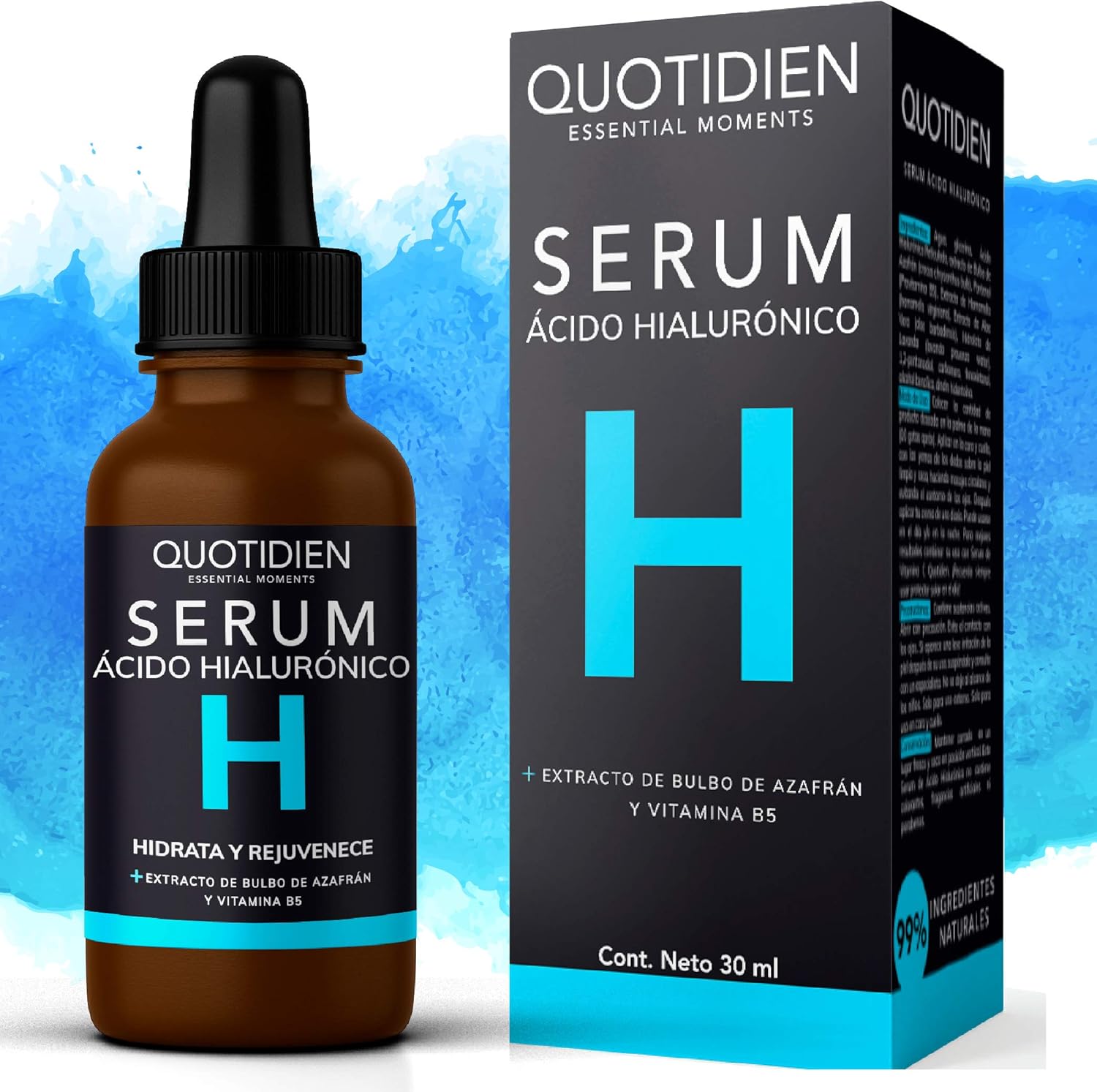 - REAFIRMANTE/ANTIENVEJECIMIENTO: El Serum de Acido Hialurónico Quotidien contiene una fórmula avanzada que combina acido hialuronico y extracto de bulbo de azafrán en su dosis justa. Esto promueve el rejuvenecimiento celular desde adentro hacia afuera, promoviendo la formación de colágeno y elastina, convirtiéndolo en el antiarrugas ideal. Usalo a diario y para mejores resultados combínalo con el Serum de Vitamina C.