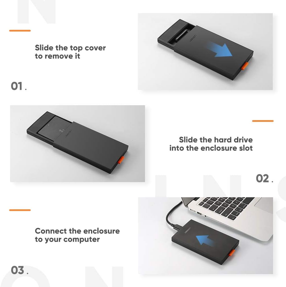 - FÁCIL MONTAJE SIN HERRAMIENTAS Muy fácil de manejar, no hacen falta herramientas. Se abre una tapa trasera (deslizante), se inserta el disco SATA 2.5", se cierra la tapa y use el cable USB 3.0 incluido para conectar la carcasa con una PC. Plug y play para Windows 10 / 8.1 / 8/7 / Vista / XP, Mac OS, Linux, Chrome OS, etc., no requiere instalación de controladores.