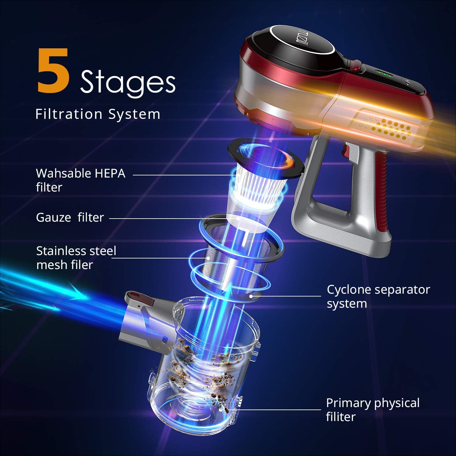 - Sistema de filtrado mejorado de 4 etapas] malla de acero inoxidable de 1 capa y 3 capas de filtros HEPA constituyen un potente sistema de filtración de limpiador vertical que es conveniente para limpiar la basura rápidamente, y evita eficazmente que el polvo vuelva al aire y causa contaminación secundaria. Además, los filtros se pueden lavar, solo necesitas sacar los filtros, lavarlos y secarlos por completo, finalmente ensamblar en la funda para garantizar una vida útil más larga.
