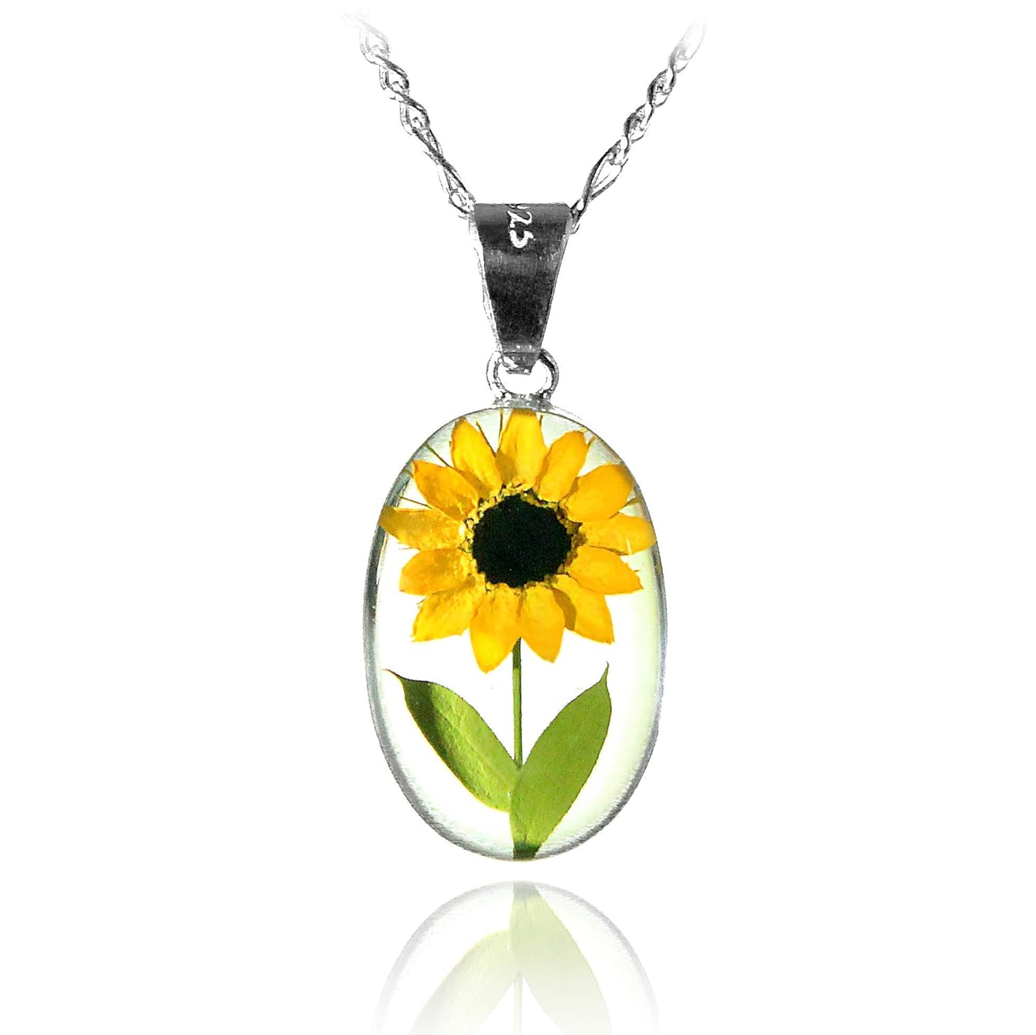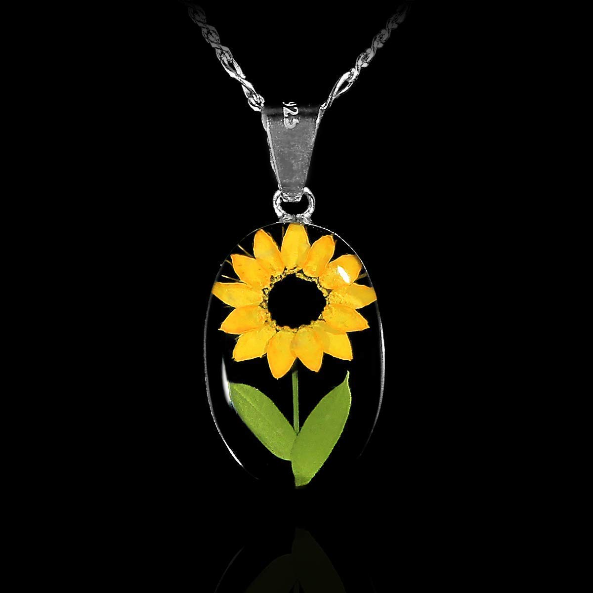 COLGANTE / COLLAR VALO -TAMI- DE PLATA 925 CON FLOR DE GIRASOL NATURAL (SÍMBOLO DE LA FELICIDAD) SOBRE FONDO TRANSPARENTE Y CADENA FGARO DE PLATA DE 45 CM INCLUYE CAJA DE REGALO Vertical Línea arriba Posición Línea abajo