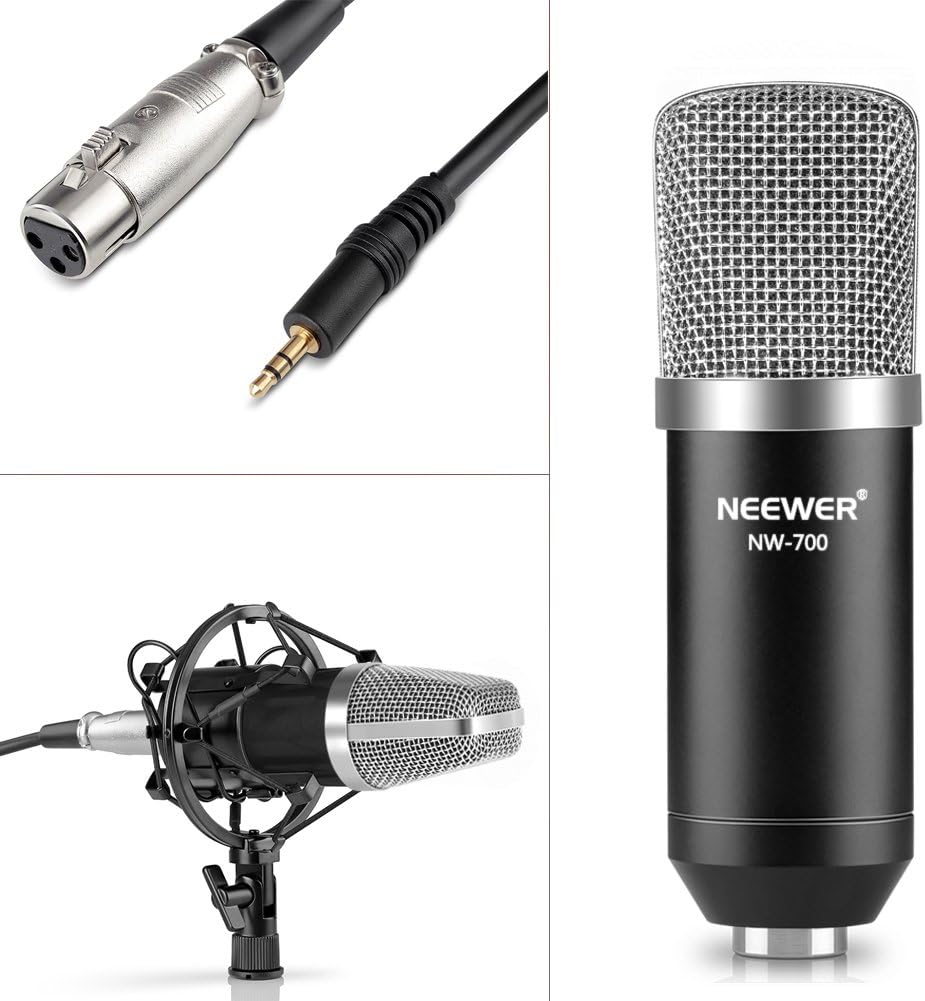 - Shock Mount Diameter: 1.6"-1.8"/43mm-46mm. Table Mounting Clamp Maximum Opening: 1.7"/4.5cm. PLEASE VERIFY the size of your microphone and the thickness of table BEFORE ORDERING;NW-35 SUSPENSION STAND: made of all steel construction, sturdy and durable. *Max load: Approx 53oz / 1.5KG*. PlEASE NOTE: This Stand is NOT Suitable for Blue Yeti USB Microphone;The NW-700 professional condenser microphone adopts the completely new audio circuit. Capture rich, full-bodied sound from sources that are directly in front of the mic. The cardioid pick-up pattern minimizes background noise and isolates the main sound source;Kit includes: (1)Condenser Microphone + (1)Metal Shock Mount + (1)3.5mm to XLR Audio Cable + (1)Ball-type Foam Cap + (1)Pop Filter + (1)Scissor Arm Stand+(1)XLR Female to XLR Male Cable + (1)Table Mounting Clamp + (1)48V Phantom Power Supply + (1)Adapter;48V Phantom Power Supply delivers reliable 48V power. Universal XLR input and output. On/off power switch and LED indicator. Comes with one adapter