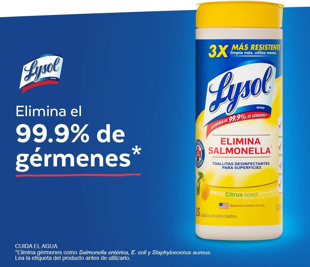 - Lysol Toallitas Desinfectantes para Superficies elimina 99,9% de gérmenes, indicados en la etiqueta de acuerdo a instrucciones de uso