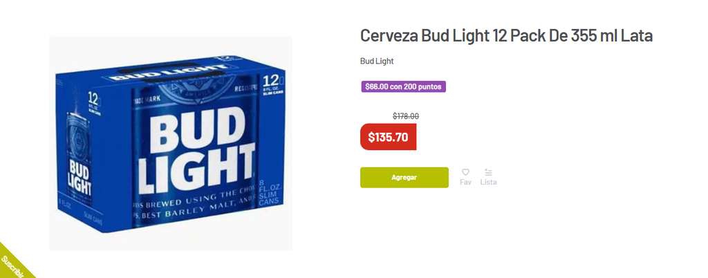 Soriana 12 Pack (355 mL) de Cerveza Bud Light a 66 MXN usando 200 puntos
