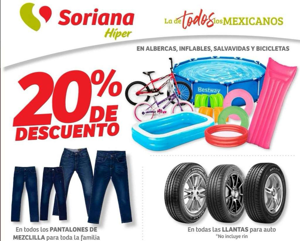 Soriana Hper y Super 20% de descuento en piscinas inflables chalecos salvavidas y bicicletas en jeans y en llantas