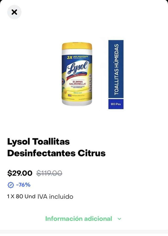 Rappi Soriana Lysol toallitas desinfectantes 80uds