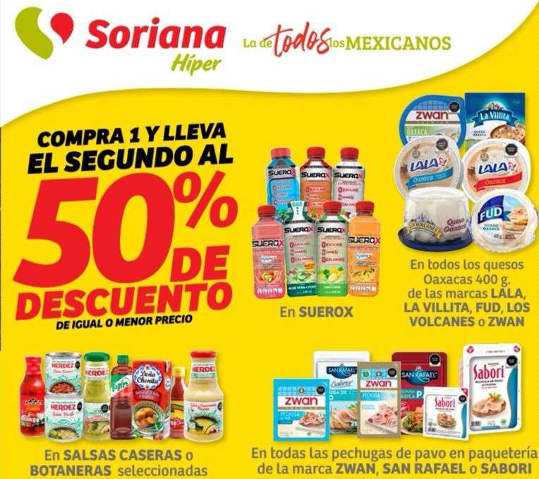 Soriana Híper y Súper: 2 x 1½ en Suerox, salsas caseras o botaneras, quesos Oaxaca 400 g, y pechugas de pavo en paquetería