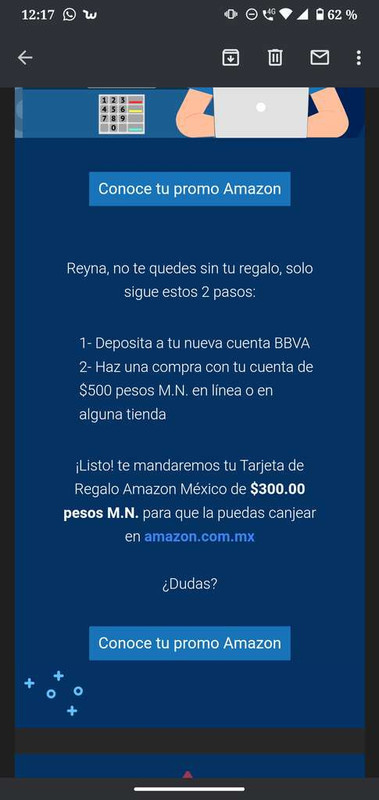 BBVA: Gift de Amazon 300MXN al comprar 500 en Amazon (tras realizar primer depósito en cuenta)