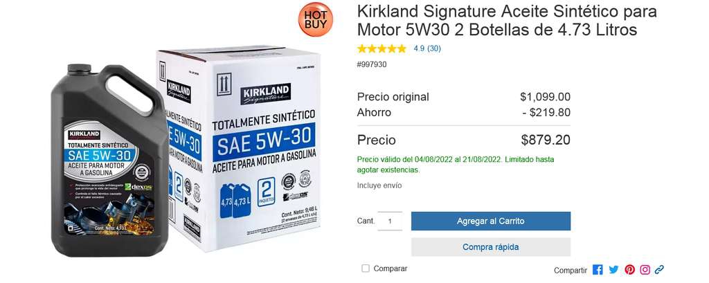 - El aceite para motor totalmente sintético 5W-30 Kirkland SignatureMR esta formulado para reducir el desgaste de las piezas y maximizar el ahorro de combustible.