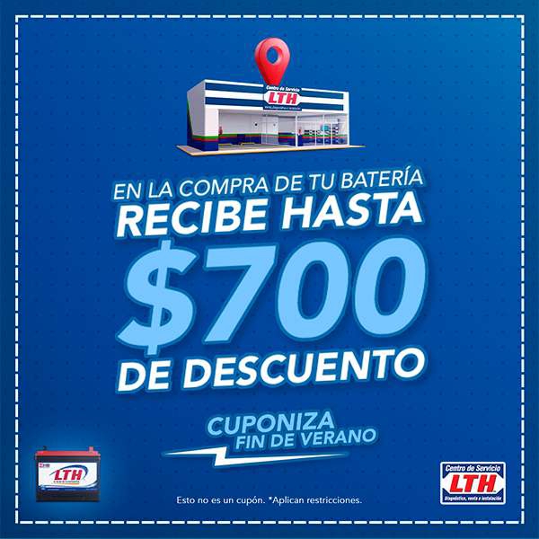 RECIBE $700 MXN DE DESCUENTO AL COMPRAR TU BATERÍA LTH AGM, LTH HI-TEC, LTH-SUV VAN-MINI VAN, LTH-TAXI, OPTIMA O FULL POWER.