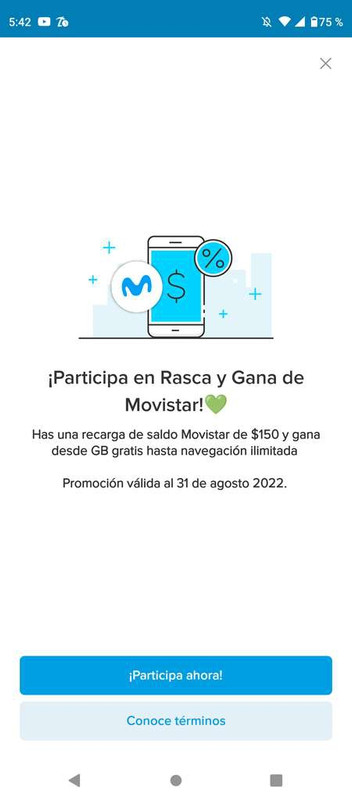 Mercado Pago Ir a la oferta Rasca y Gana Movistar” Promoción valida del 1 al 31 de agosto del 2022. Para participar en esta promoción, realiza una recarga de $150.00 en Mercadopago* y obtén una participación en “Rasca y Gana Movistar” y participa para ganar una de estas recompensas tras responder correctamente a una pregunta. Podrás ganar uno de los siguientes beneficios: 2 GB TikTok, 1 GB de navegación + 1 GB TikTok, 2 GB de navegación, 3 GB de navegación, 4.5 GB de navegación, 5 GB de navegación. Los beneficios solo podrán ser usados para navegar en México, con una vigencia de 26 días.