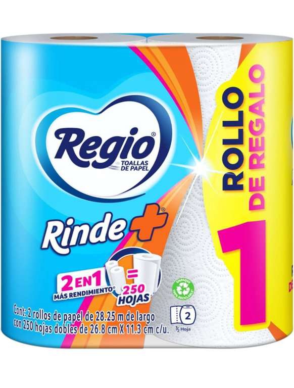 Amazon: Regio Rinde+ Toallas de papel, 250 hojas dobles, 1 rollo + 1 rollo gratis (envío gratis prime)