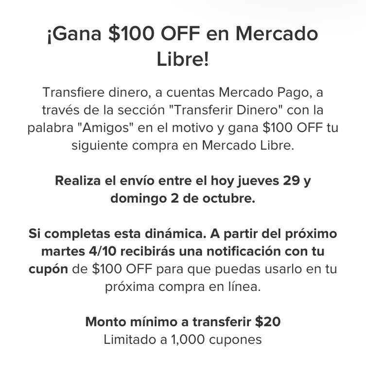 Mercado Pago: Cupón de 100 pesos en compra mínima de $101 al transferir dinero con el texto "Amigos" en el motivo