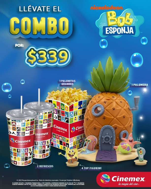 Cinemex Combo Bob Esponja: palomera + 4 figuras + 2 refrescos grandes + palomitas grandes