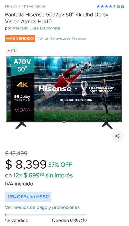 Pantalla Hisense Mercado Libre: 7gv 50" 4k Uhd Dolby Vision Atmos Hdr10