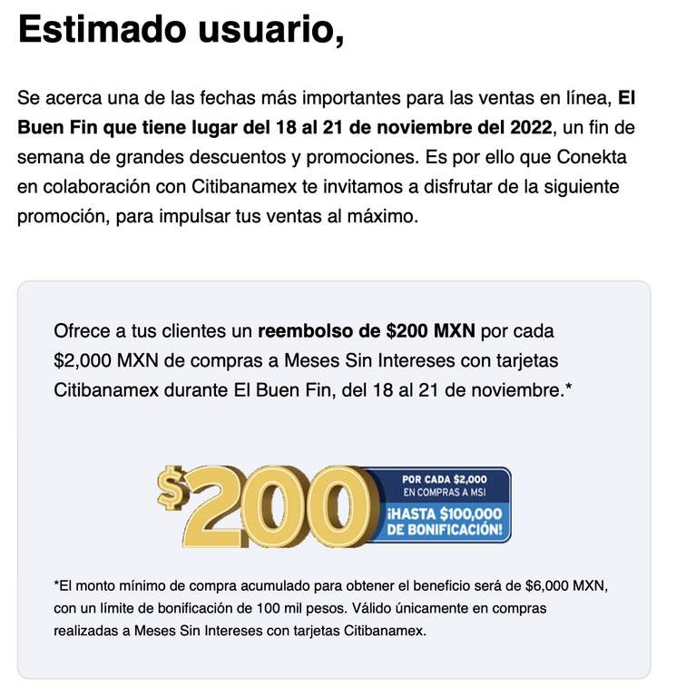 Citibanamex Ir a la oferta />*El monto mínimo de compra acumulado para obtener el beneficio será de $6,000 MXN, con un límite de bonificación de 100 mil pesos. Válido únicamente en compras realizadas a Meses Sin Intereses con tarjetas Citibanamex.