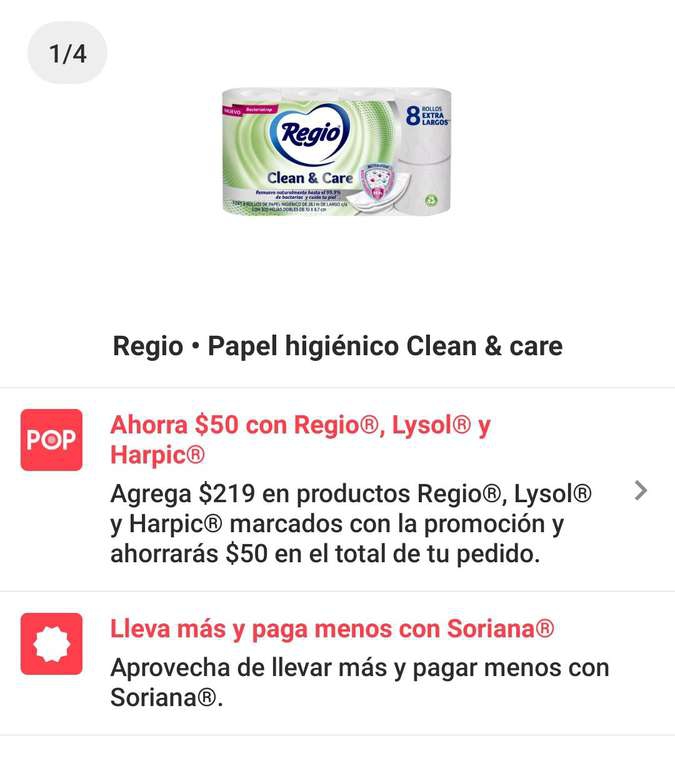 Al agregar 4 paquetes de 8 rollos, cada paquete queda en $32.5