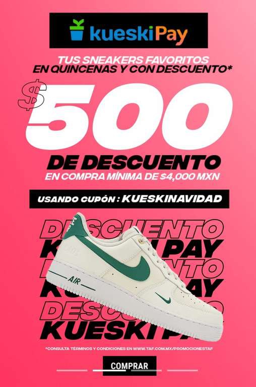 TAF Ir a la ofertaEn la compra de 4000 pesos como mínimo y aplicando el cupon KUESKINAVIDAD te descuenta 500 en las página o app de TAF, el cupon puede ser usado hasta en 2 ocasiones, la compra solo aplica en la sección kueski.
