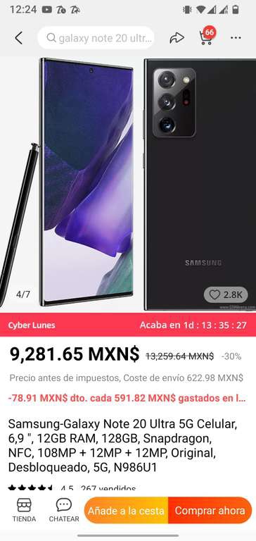 AliExpress Samsung Galaxy Note 20 ultra (Reacondicionado) | $ 8516 (incluido el envío)