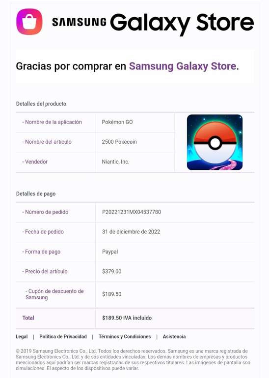 Cupón 50% de descuento galaxy store pokemon go aumentado a 200 pesos