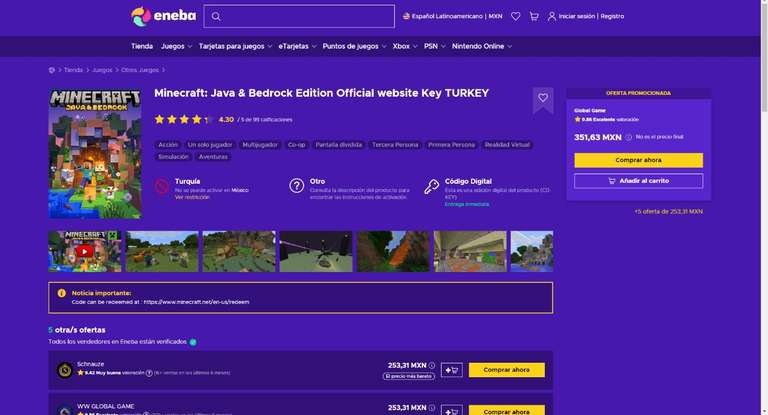 Eneba Ir a la ofertaAmbas versiones por 285, muy buena oferta ya que en la pagina de minecraft te sale como en 600 pesos.