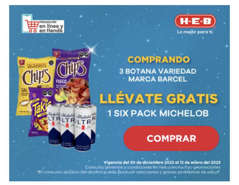 HEB Ir a la ofertaCompra 3 botanas variedad barcel y te llevas gratis un 6 pack de Michelob