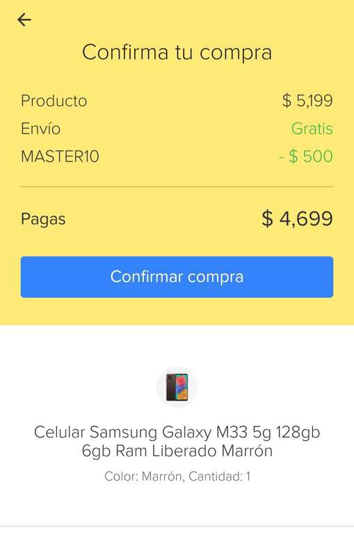Mercado Libre Ir a la ofertaSe llega al precio pagando con el cupón de MASTER10. Vendido por Mercado Libre Electrónica. Trae características bastante decentes y la compatibilidad con 5G, no es el precio más más bajo posible pero creo que no está tan mal