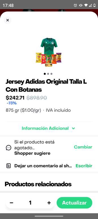 RappiEn rappi turbo esta el pack que contiene jersey Adidas original selección mexicana + botanas sabritas (6 unidades) 5 bolsas de botana + 1 dip tostitos con 70% de descuento disponibilidad depende de la zona, visto en cdmx
