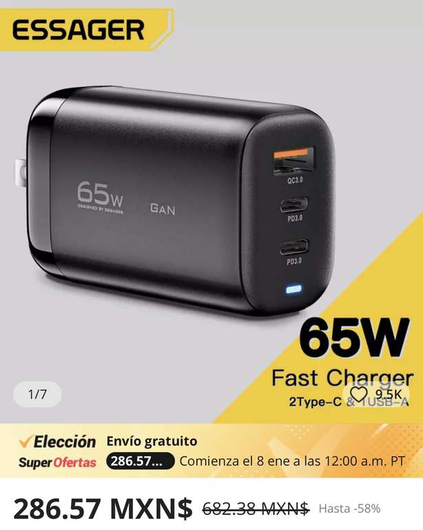 Aliexpress: Essager Cargador GAN 65W Usb-C y USB