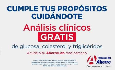 Farmacias del Ahorro Ir a la ofertaAcude a tu AhorroLab más cercano y solicita tus análisis clínicos gratis. Aplica en análisis de Glucosa, Colesterol y Triglicéridos.