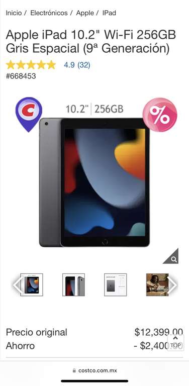 Costco: Apple iPad 10.2" Wi-Fi 256GB Gris Espacial (9ª Generación) Costco