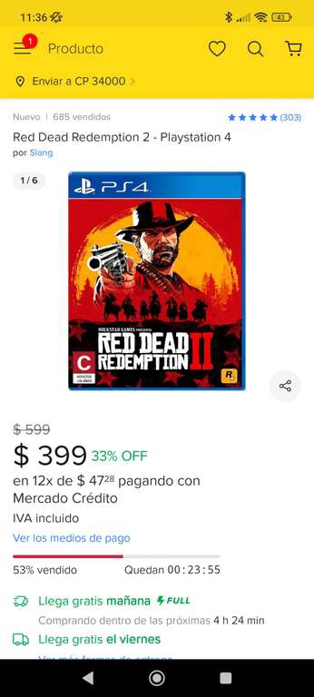 Mercado Libre oferta relámpago de red dead redemption 2 PS4 con envío COMPLETO