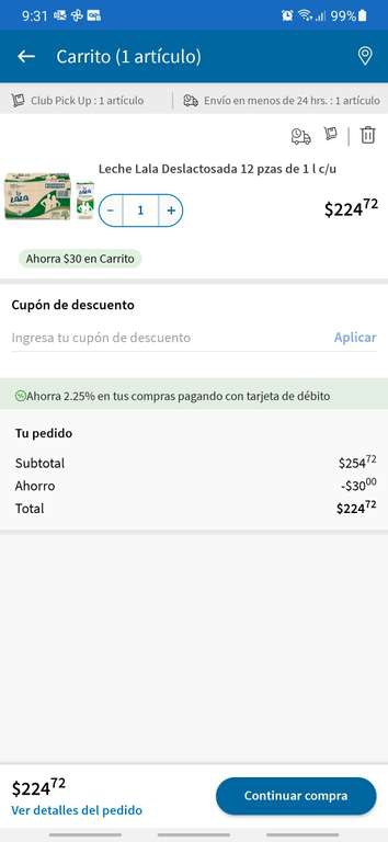 Sam's Club Ir a la oferta12 litros de leche lala deslactosada en $224 te sale el litro a $18.66 es muy buen precio. Debes de agregar al carrito de compras para que se vea reflejado el precio.