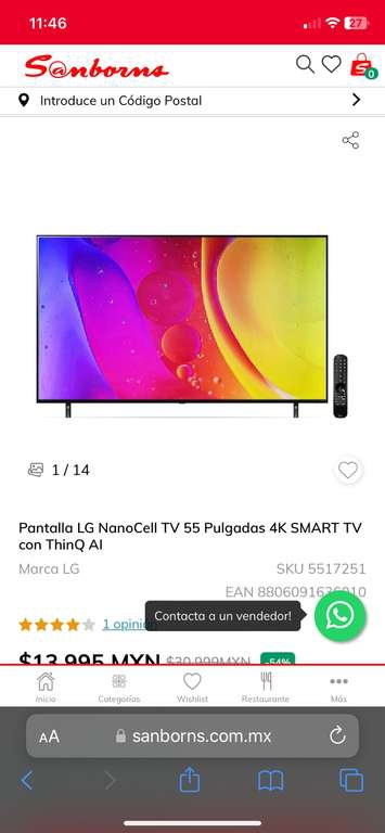 Sanborns Ir a la ofertaSus Nano particulas filtran y refinan los colores impuros dando una imagen mas vibrante y realista. Disfruta tu contenido favorito con la mejor calidad en imagen y audio que se ajustan automaticamente gracias al nuevo procesador a5 Gen5 AI Processor 4K, tambien compatible con Active HDR y FILMMAKER MODE. Todos tus juegos subiran de nivel con Game Optimizer que ajusta automaticamente la configuracion de la imagen, optimizando graficos y la visibilidad para ofrecer una mejor experiencia de juego. El sonido envolvente Bluetooth Surround lleva la atmosfera del estadio a tu hogar, mientras que Sport Alert te mantienen actualizado con las ultimas noticias de tus equipos favoritos. Controla el TV con tu voz con LG ThinQ AI y con asistentes virtuales integrados (Google Assistant & Amazon Alexa) y compatibilidad con Apple AirPlay2 y Apple HomeKit.