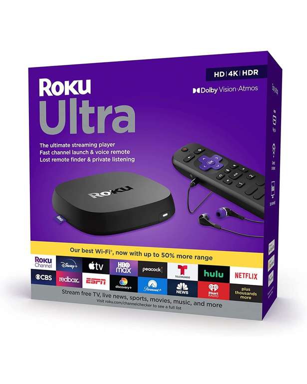 Amazon Ir a la ofertaRoku Ultra 2020 (Version US) | Reproductor multimedia de transmisión HD / 4K / HDR / Dolby Vision con Dolby Atmos, transmisión por Bluetooth y control remoto por voz Roku con conector para auriculares y accesos directos personales, incluye cable HDMI® premium