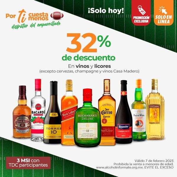 32% de descuento en vinos y licores.