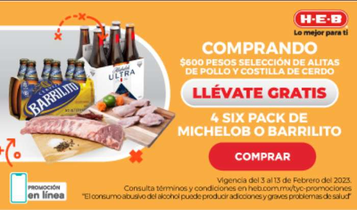 HEB 24 Cervezas Michelob Ultra o Barrilito en la compra de 600 pesos de Alitas y Costillar de Cerdo
