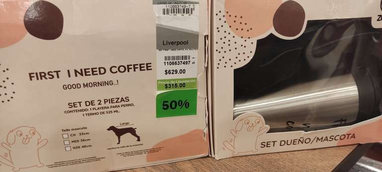LiverpoolUn termo para el café o lo que gusten y una playera para el lomito. El artículo en línea su precio es de $315.