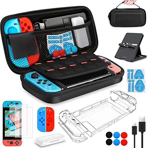 Amazon Ir a la oferta- 20 en 1 nintendo switch accesorios: el kit nintendo switch incluye 1 bolsa de almacenamiento (para consola y accesorios), 2 protector de pantalla (que incluye todo lo necesario para la instalación), 2 cubierta para Joy-Con y consola, 1x protector nintendo switch delgada y resistente a los arañazos, 1x soporte de nintendo switch ajustable de múltiples ángulos, 1x caja de tarjeta de juego, 1x cable USB, 6 tapas del Joy-Con pulgar grips.